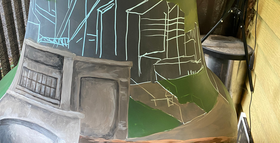 After the base coats dried, I worked my way around the bell, adding more layers, more depth, and more color. During this time, the bell moved to my in-laws' garage, as the weather was making painting outside impossible! Each pass brought the fields, mountains, and sky to life. When the whole design was established, I went back in for the best part, the details. Tiny highlights, texture, shadows, all the little touches that make a piece feel finished.