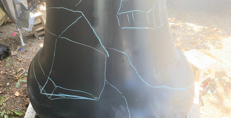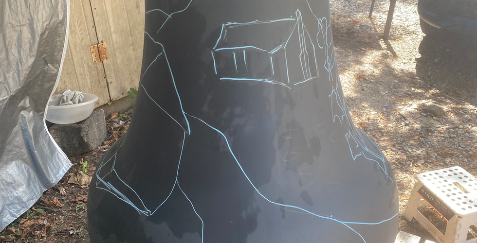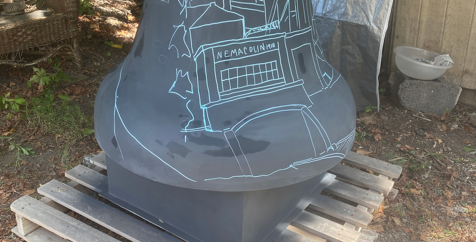 Before any paint could go on, I sanded the entire bell. Then I primed it, gave it another sanding, and got the surface as smooth as possible. After the primer cured, I washed off all the sanding dust and started transferring the design section by section. This part felt like laying out a giant puzzle. And it definitely got tricky. The original design was drawn flat, but the bell curves in multiple directions and the top flares out into the lower section. Adjusting for perspective and making sure every detail still looked good on a rounded surface took some time and patience. Most of this work took place during September, under a small canopy to keep the bell safe from the weather.